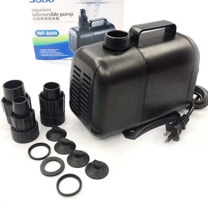 واترپمپ 120 وات سوبو WP-8000 دارای توان خروجی 5000 لیتر در ساعت بوده و ارتفاع پرتاب آب توسط آن 5.5 متر است.برند سوبو واتر پمپ های سری wp خود را در توان و مدل های مختلفی تهیه نموده است که در آبنما ها و آکواریوم هایی با حجم ها و توان های مختلف مورد استفاده قرار می گیرند. کیفیت بالای ساخت و دوام و ماندگاری بسیار خوب موجب شهرت این برند در بین علاقمندان به این حوزه ها شده است.