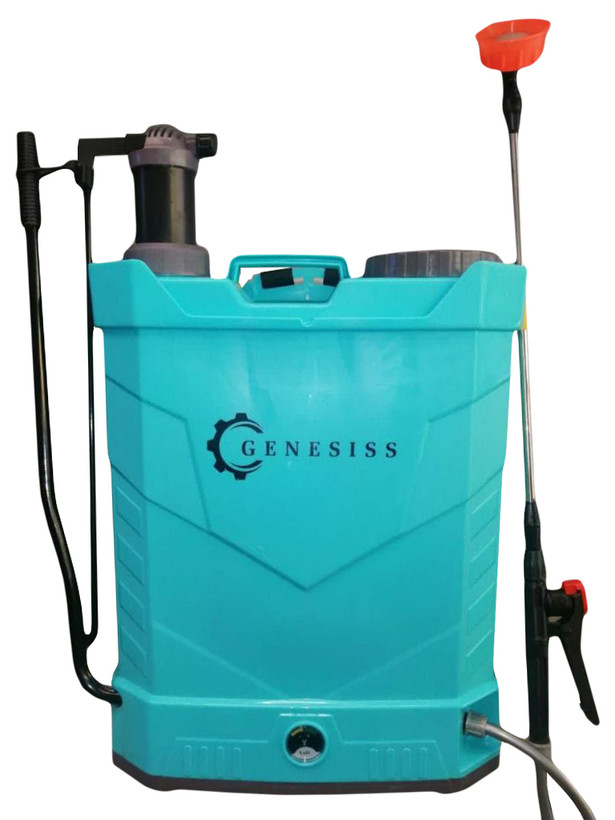 دستگاه پشتی دوکاره جنسیس دارای بدنه بسیار با کیفیت بالای تزریقی است. این سمپاش دارای باتری 12 ولت 8 آمپر می باشد. این سمپاش دارای امکان سمپاشی با حالت دستی نیز می باشد. برای استفاده از این حالت یک پمپ دستی نیز به دستگاه اضافه شده است. که می بایست شیلنگ خروجی از قسمت خروجی پمپ شارژی باز شده و به قسمت خروجی پمپ دستی که بالای دستگاه می باشد نصب شود. با توجه به اینکه ممکن است شارژ باتری پس از چند ساعت تمام شود و امکان شارژ آن نباشد، می توان از حالت دستی سمپاش استفاده نمود. سمپاش پشتی دوکاره جنسیس امکان تعویض راحت باتری را دارد. پشت سمپاش محفظهای برای خارج کردن و تعویض سریع باتری تعبیه شده که در صورت همراه داشتن باتری یدکی شارژی به راحتی میتوانید آن را تعویض نمایید.
